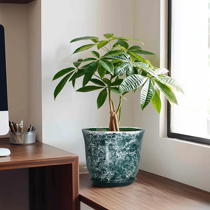 8 Inch Plant Pot - Ceramic Planter with Drainage Hole and Saucer, Round Planter for Indoor Outdoor, Modern Planters, Decorative Flower Pots, Office Room Home Decor, Plant Lover Gifts, Green
