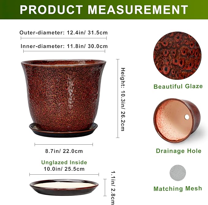 - Ideal Size: These ceramic pots for plants measure 12.4" x 12.4" x 10.3" and comes with drainage holes, a ceramic plant saucer, a drainage net, creating a healthier environment for plants while keeping your space neat and clean