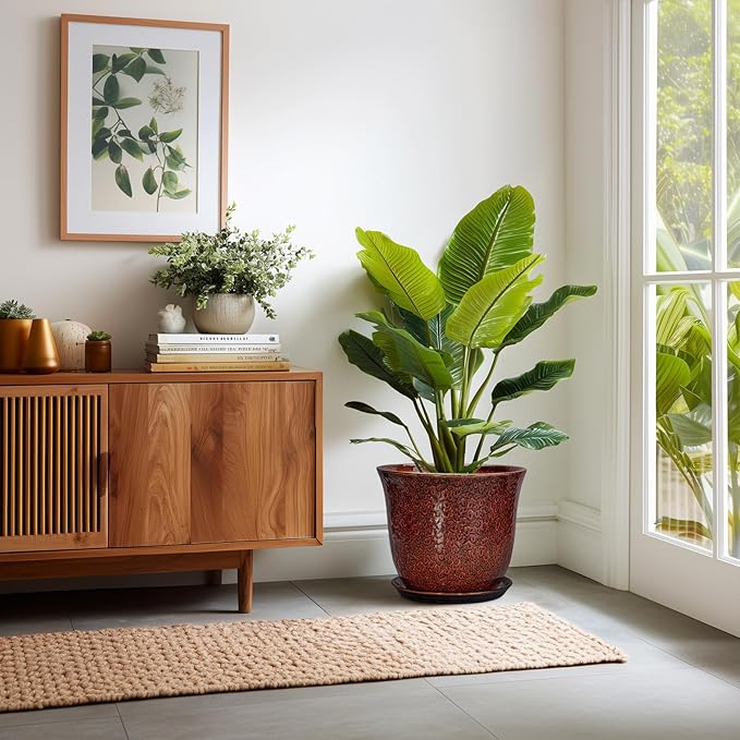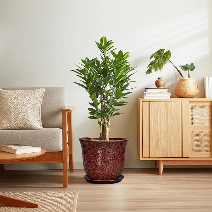 Ceramic Pots for Plants - 12 Inch Plant Pot for Indoor Outdoor, Round Planter with Drainage Hole and Saucer, Large Decorative Planters, Modern Flower Pot, Office Decor, Garden Gifts, Red