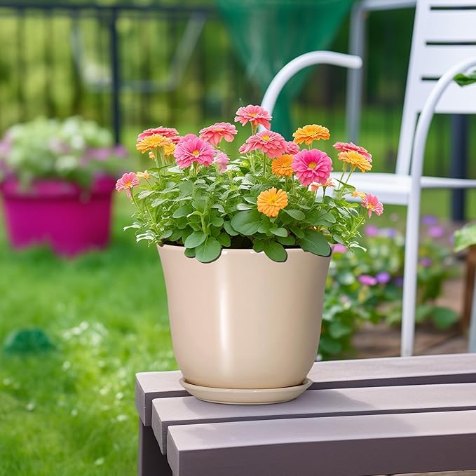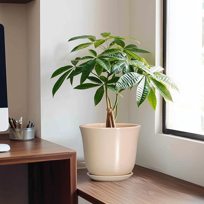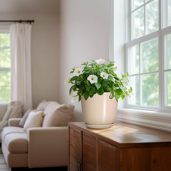 8 Inch Plant Pot - Ceramic Pots for Plants Indoor Outdoor, Round Flower Pots with Drainage Hole and Saucer, Modern Decorative Planters, Home Office Desk Room Decor, Plant Lover Gifts, Beige