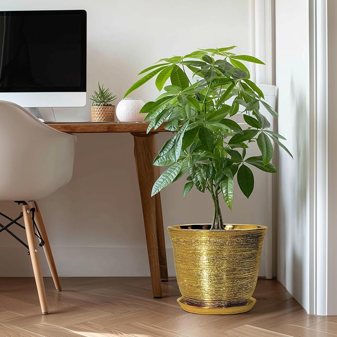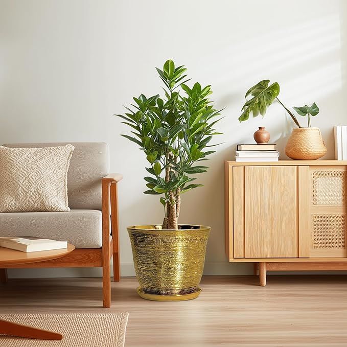 Ceramic Pots for Plants - 12 Inch Planter for Indoor Outdoor, Round Plant Pot with Drainage Hole and Saucer, Decorative Large Planter, Modern Flower Pots, House Decor, Garden Gifts, Gold