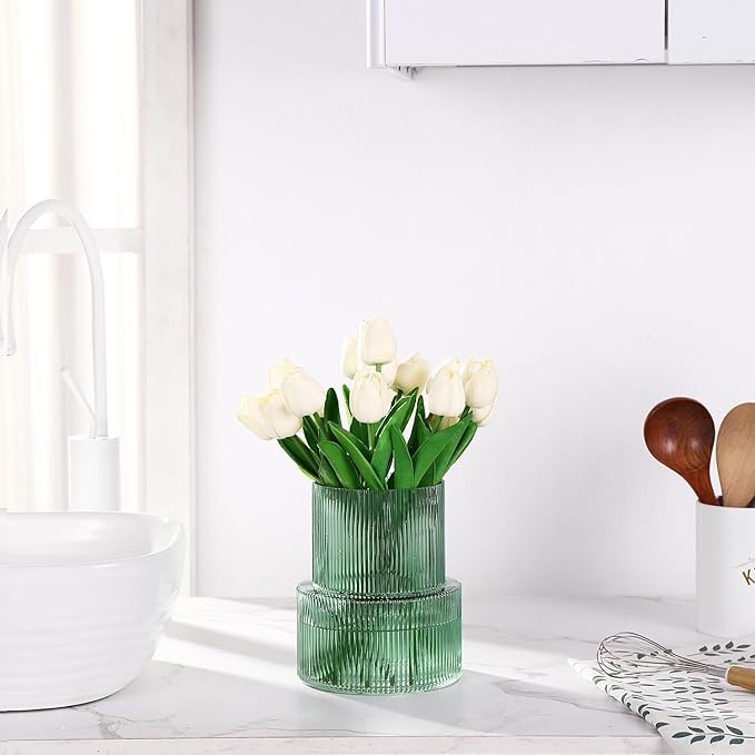 Green Glass Vase, Ribbed Glass Vase for Tulips, Flower Vases for Bouquet, Green Modern Vases for Living Room, Dining Table, Entryway, Mantle, Shelf, Wedding, Office, 7.5 Inches