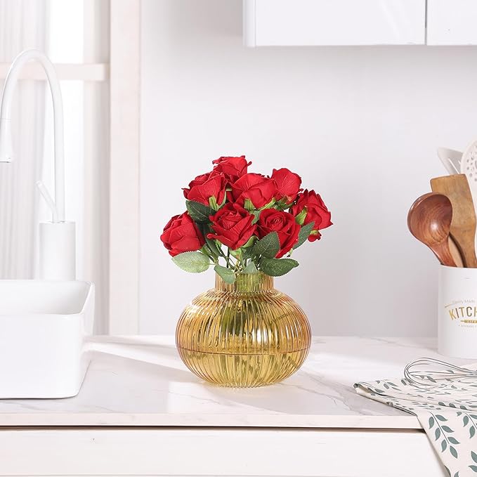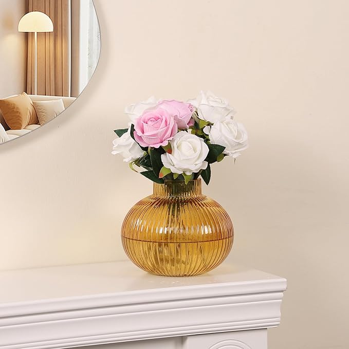 Amber Glass Vase for Tulips, Ribbed Glass Vase for Flowers, Round Flower Vases, Small Short Vases for Living Room, Office, Coffee Table, Shelf, Wedding, 6 Inches