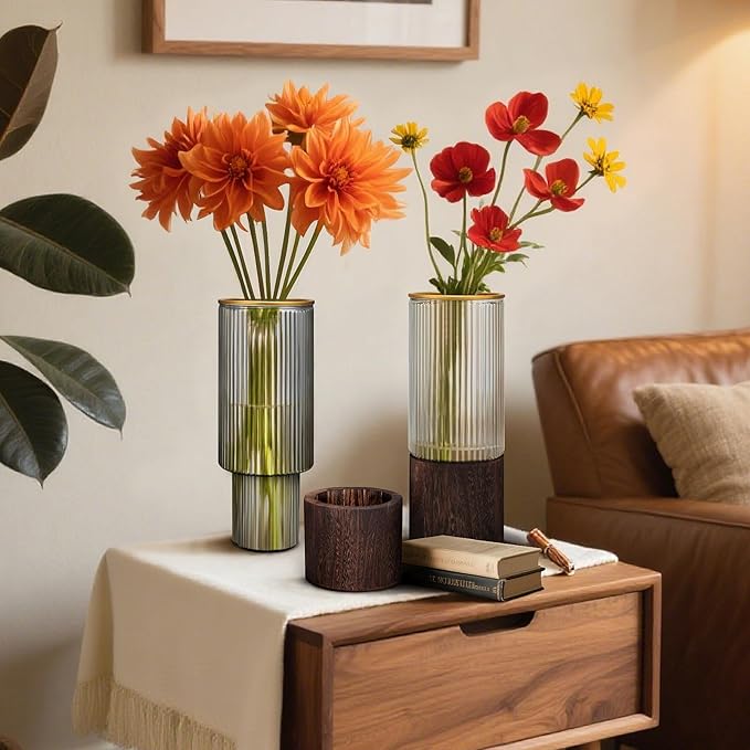- Wood Glass Vase Set of 2: Get 2 clear glass vases with solid wood base in 2 different color(Gray & Clear),each ribbed glass vase measures 3.94''W x 9.84''H (10 x 25 cm),perfect for various floral arrangements and fits any decor.