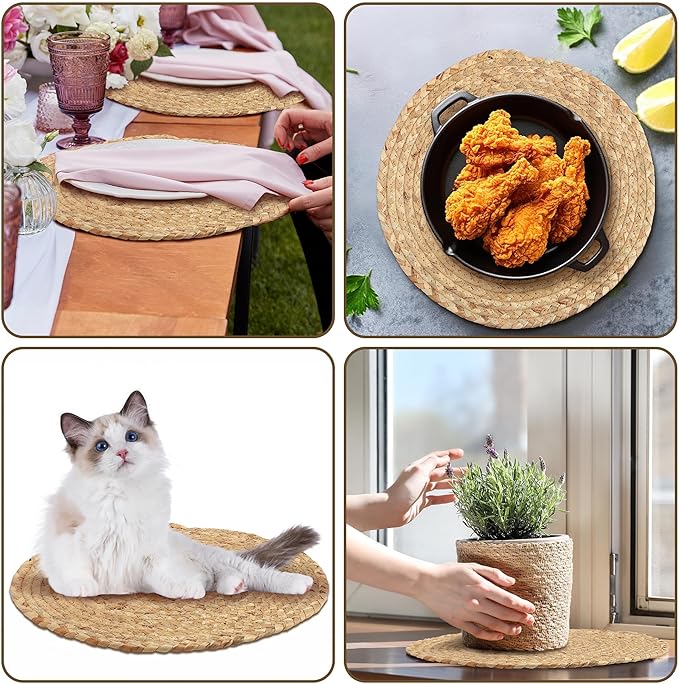 - Natural Materials: Handcrafted from materials like cattail grass (water hyacinth) by skilled artisans, these round woven placemats offer a sturdy, woven design and circular outline. These natural wicker placemats create a warm dining experience and can be matched with a wooded table, glass table, marble table, metal table, etc. Note: the color of grass is different from season to season, please understand.
