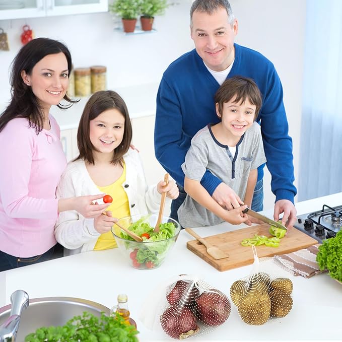 - 【MESH DESIGN】The mesh design helps you directly see the items contained inside the onion bags, and increases the breathability of the net bags for produce, allowing the stored fruits, vegetables, seafood, etc. to breathe effectively, so that prolonging their freshness