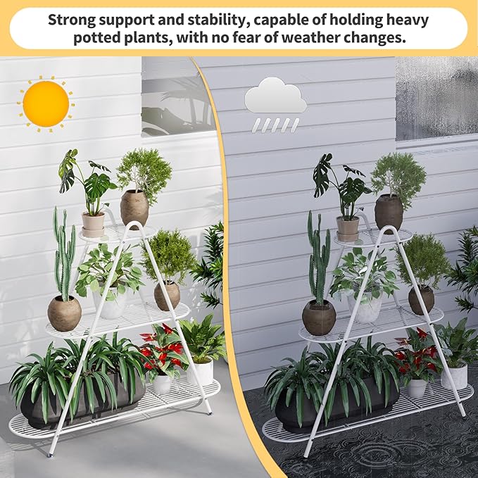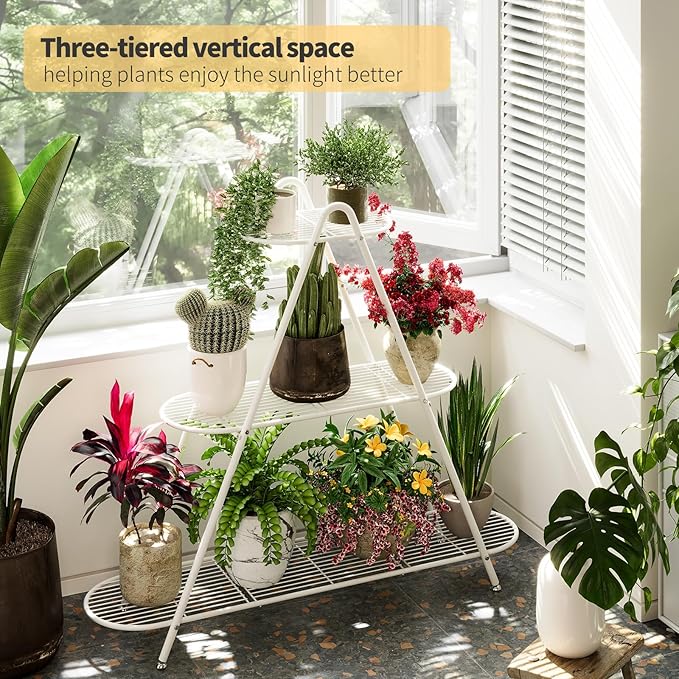 Plant Stand for Patio, 3-Tier Metal Plant Shelf–Indoor/Outdoor Display Rack for Multiple Pots, Heavy Duty Plants, Garden Flower Organizer (White)