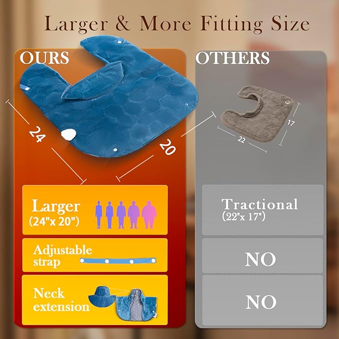 - Larger and more fitting size: designed according to the structure of the human body, it fits the neck and shoulder curves, making it more comfortable to wear. 24*20 large size, 2 inches more than other products, adjustable strap design, suitable for different body shapes, no matter fat or thin. And the neck extension design allows your neck to enjoy the heat therapy. The light weight of 1.2lb is comfortable even for elderly parents