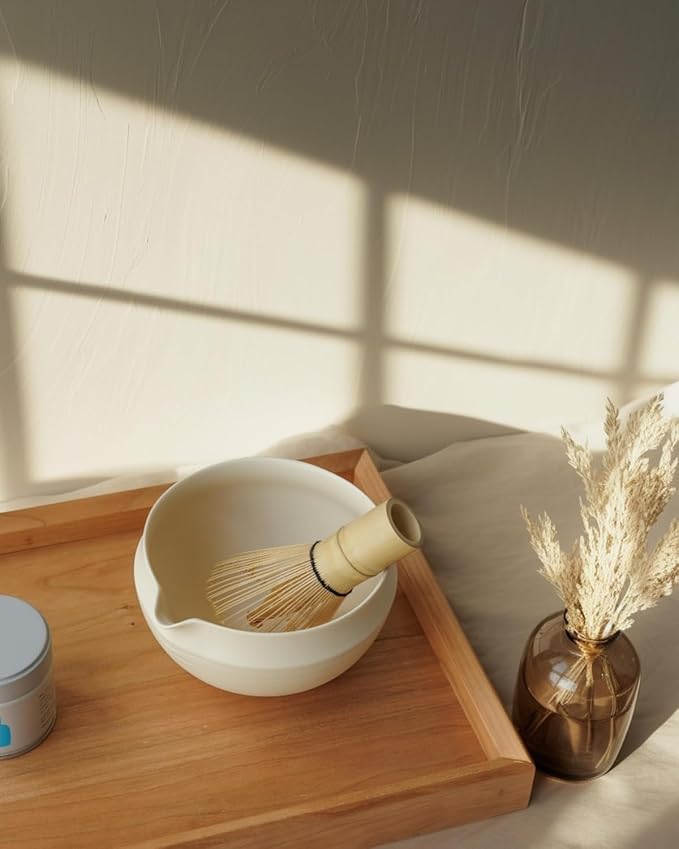 - All-in-One 5-Piece Set – Includes everything you need for matcha at home: a natural bamboo whisk, a ceramic whisk holder, a bamboo scoop, a fine stainless steel sifter, and a durable ceramic matcha bowl. Compact and easy to store, perfect for both beginners and daily rituals.