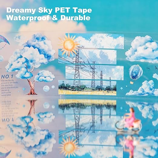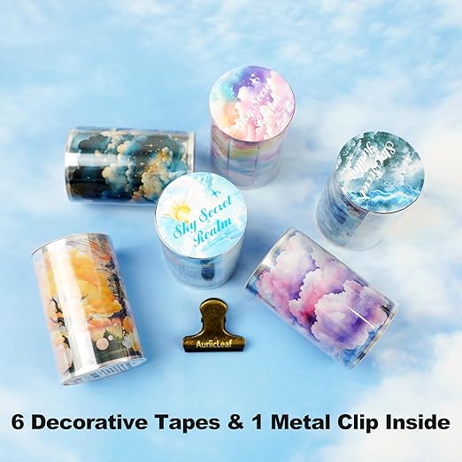 - Dreamlike Sky Themes: Includes 6 rolls featuring unique illustrations of thunderstorm starry night sunset and foggy clouds each delivering a different tone and color palette to enrich scrapbook and journal pages with visual depth