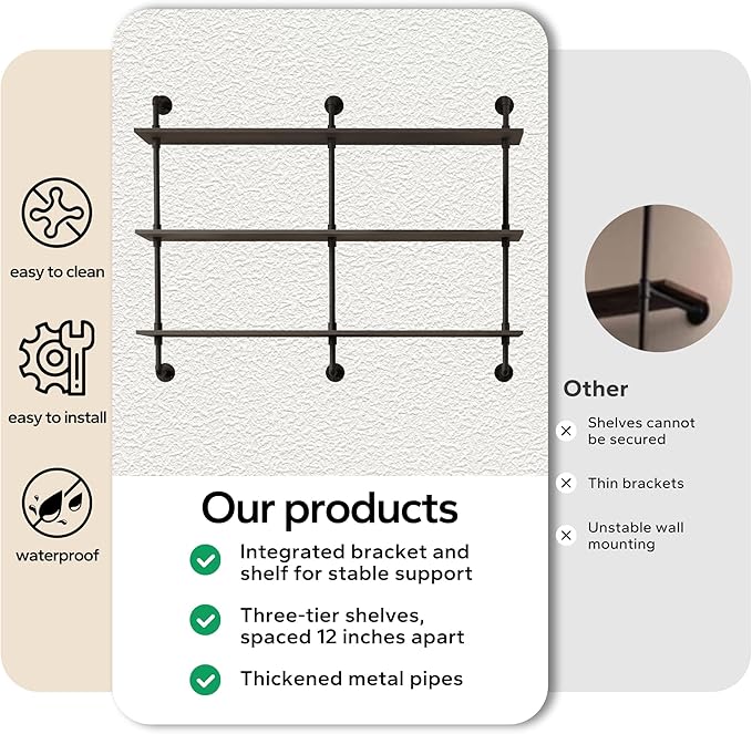 - Vintage Industrial Charm:Featuring a rustic industrial design, this floating shelf combines wooden boards with a distressed finish and iron pipes with a matte black finish for a vintage yet modern look. The anti-rust treatment on the metal ensures durability, making it suitable for both indoor and outdoor use.
