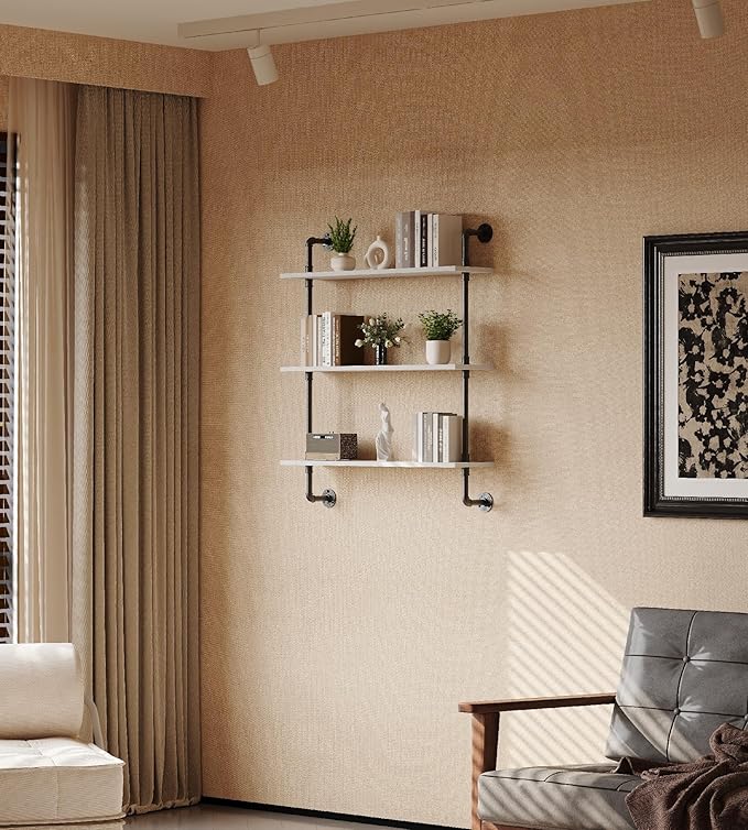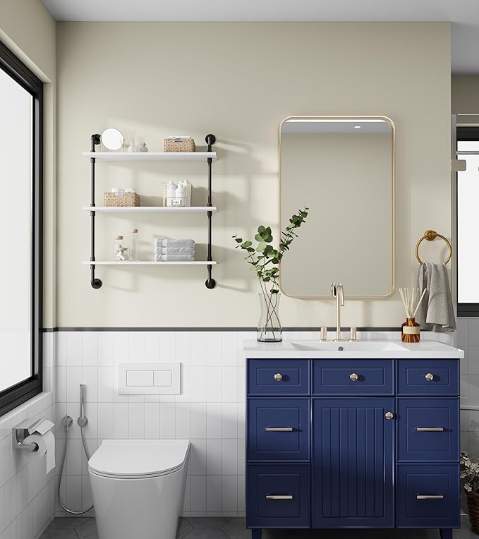 3-Tier Industrial Pipe Floating Shelf – Rustic 24 inch Wood Wall-Mounted Storage Shelf for Kitchen Office,Bathroom & Home Decor -White