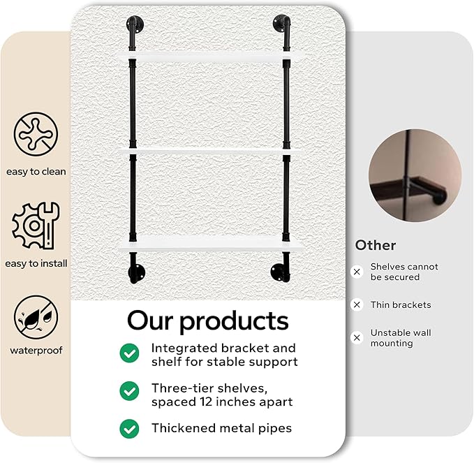 - Vintage Industrial Charm:Featuring a rustic industrial design, this floating shelf combines wooden boards with a distressed finish and iron pipes with a matte black finish for a vintage yet modern look. The anti-rust treatment on the metal ensures durability, making it suitable for both indoor and outdoor use.