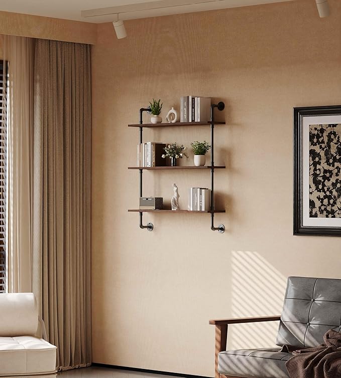 - Vintage Industrial Charm:Featuring a rustic industrial design, this floating shelf combines wooden boards with a distressed finish and iron pipes with a matte black finish for a vintage yet modern look. The anti-rust treatment on the metal ensures durability, making it suitable for both indoor and outdoor use.