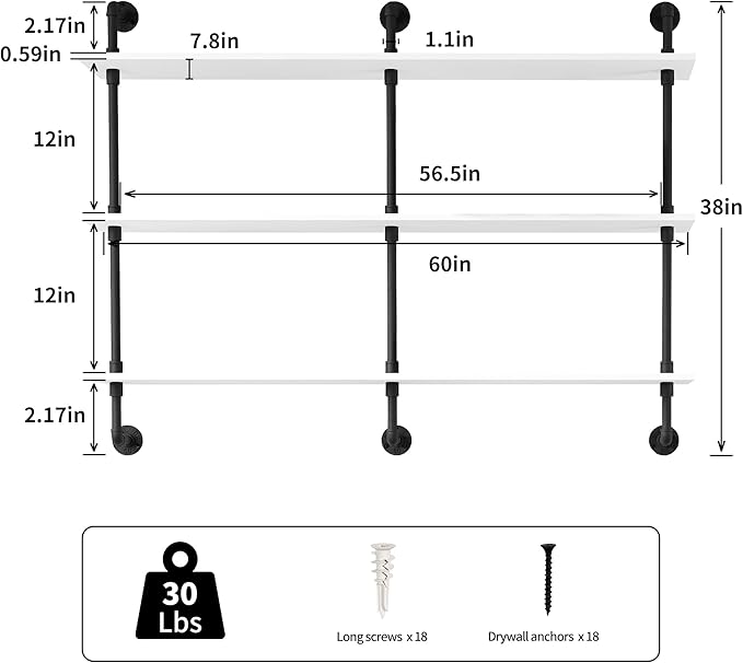 3-Tier Industrial Pipe Floating Shelf – Rustic 60 inch Wood Wall-Mounted Storage Shelf for Kitchen Office,Bathroom & Home Decor -White