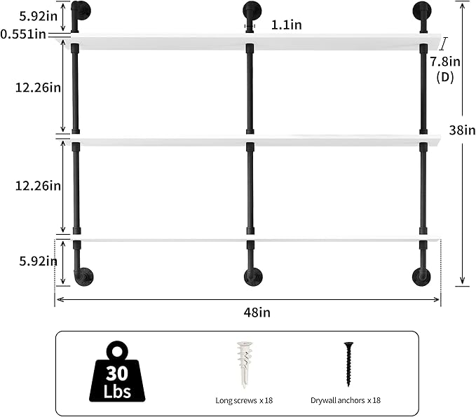 3-Tier Industrial Pipe Floating Shelf – Rustic 48 inch Wood Wall-Mounted Storage Shelf for Kitchen Office,Bathroom & Home Decor -White