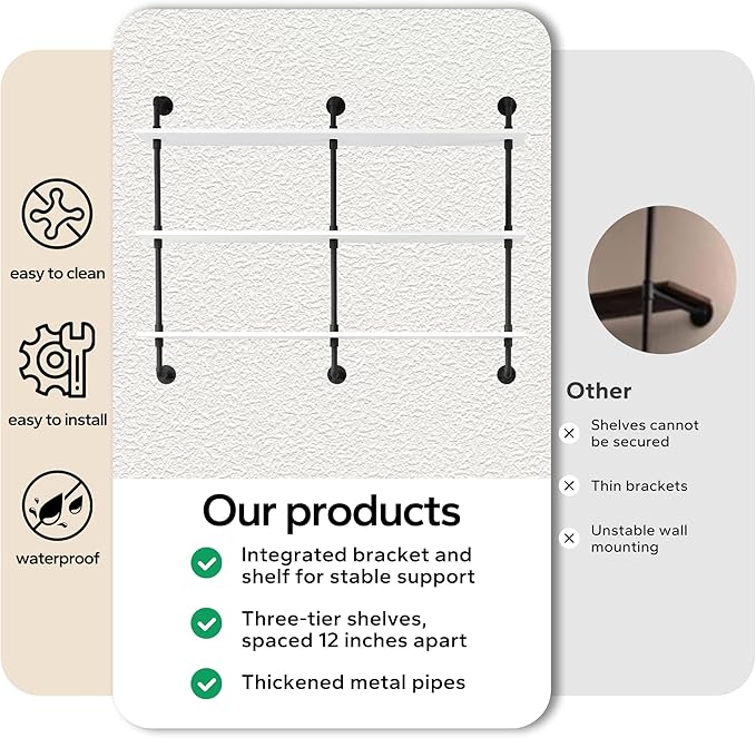 - Vintage Industrial Charm:Featuring a rustic industrial design, this floating shelf combines wooden boards with a distressed finish and iron pipes with a matte black finish for a vintage yet modern look. The anti-rust treatment on the metal ensures durability, making it suitable for both indoor and outdoor use.