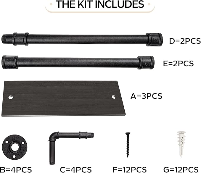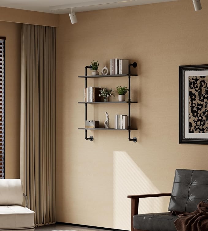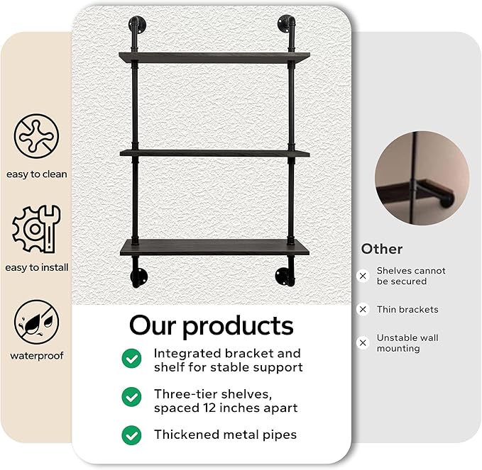 - Vintage Industrial Charm:Featuring a rustic industrial design, this floating shelf combines wooden boards with a distressed finish and iron pipes with a matte black finish for a vintage yet modern look. The anti-rust treatment on the metal ensures durability, making it suitable for both indoor and outdoor use.