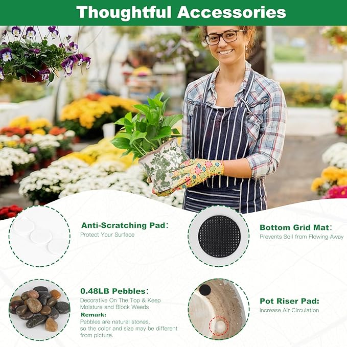 - 【Plant Pot With Drainage Hole & Saucer】Ceramic flower pots for indoor plants has a nice size drainage hole at the bottom to prevent overwatering and flooding. Plant pots indoor is equipped with removable saucer to capture overflow water for easy cleanup. We provide leak-proof mesh pads to keeps soil from running away. Protective pad at the bottom protects your tabletop. Transparent pot riser pad--Leave a small gap between the bottom of planters and its saucer to increase air circulation.
