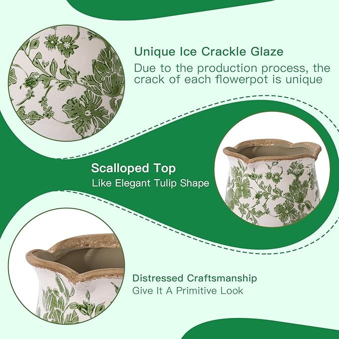 - 【Exquisite Vintage Aged Design】This planters for indoor plants features rustic ice crack glaze patterns and hand-made brown smudges--unique distressed craftsmanship, which gives it such a unique, antique look, like something you’d find in an old times but it still feels fresh and modern. Due to the production process, the crack and brown smudges of each ceramic flower pot is unique.