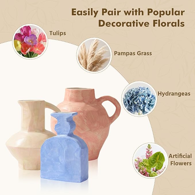 - 【Handcrafted Ceramic Vase – Unique Watercolor Finish】: Each 7-inch ceramic vase is individually hand-painted with a soft watercolor-inspired glaze, making every piece one-of-a-kind. The artistic brushstroke texture adds warmth and character, ideal for elevating modern, farmhouse, boho, or cottagecore home décor.