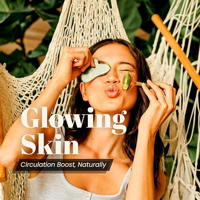 - 2-in-1 Skincare Set – Includes a facial roller for gentle massage and a Gua Sha board for deeper contouring, improving skin elasticity and reducing the appearance of fine lines.