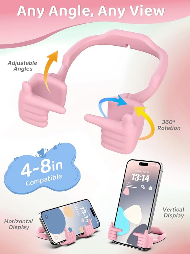 - Patented 360° Rotation & Adjustable Angle Phone Holder for Desk: Discover unparalleled viewing flexibility with our CALDEVER Shy gesture thumbs phone stand, featuring an exclusive 360-degree rotating head and unique adjustable wrist angle; Seamlessly switch between horizontal and vertical screens, finding your perfect 0-40° viewing angle for any task; This universal cell phone holder ensures ultimate stability for your phone or iPad mini, making it the ideal phone stand for desk or table