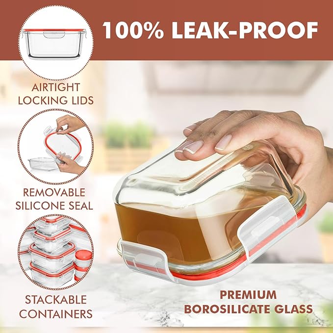 - 35 Piece Set – Multi purpose set. BPA free, non-toxic. Includes 15 glass food storage containers in small, medium and large sizes with 15 lids, removable silicone seal for easy cleaning. Stain and odor resistant. Bonus 5 plastic condiment containers. These glass containers are perfect for storing leftovers or planning ahead with your weekly meal prep.