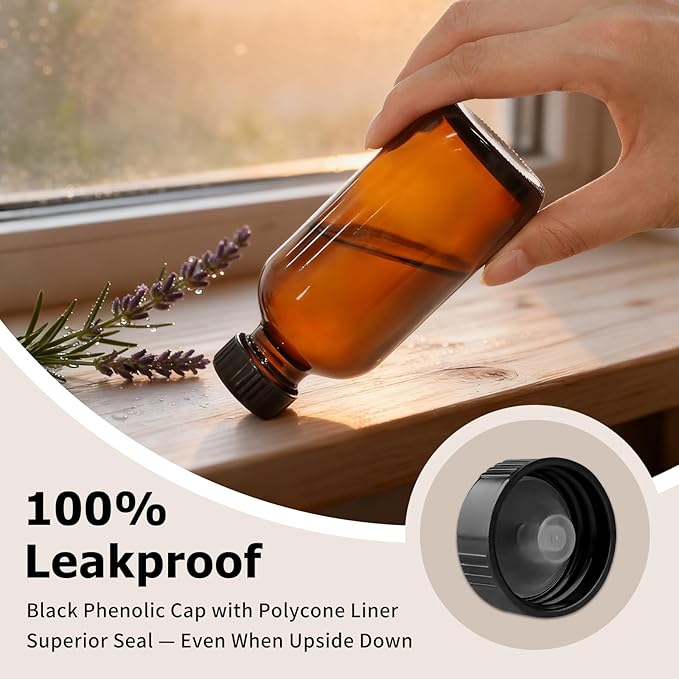 - Leak-Proof & Airtight Seal:Each bottle is equipped with a black phenolic cap and a polycone liner that forms a secure, airtight seal — ideal for home brewing, essential oils, herbal infusions, or fermented goods.