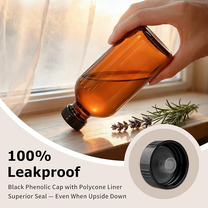 - Leak-Proof & Airtight Seal:Each bottle is equipped with a black phenolic cap and a polycone liner that forms a secure, airtight seal — ideal for home brewing, essential oils, herbal infusions, or fermented goods.