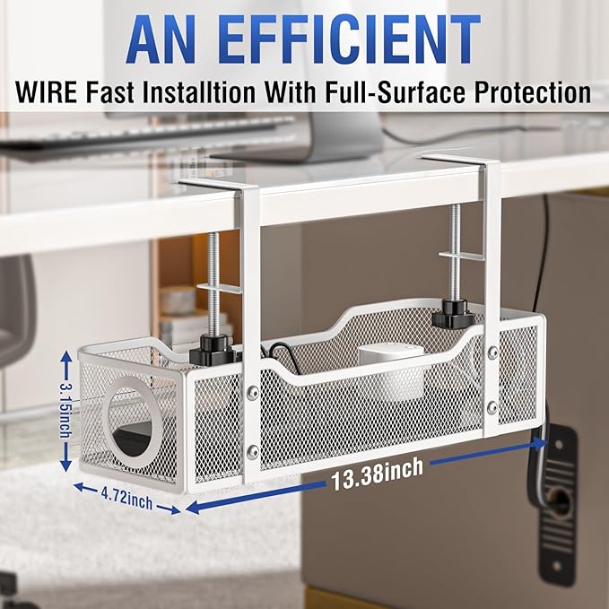 - 【No Drill Required】 Our cable management tray installs in three minutes or less using a simple clamp-on system. Anti-slip rubber pads protect your desk from scratches and damage. No drilling, adhesives, or permanent alterations are needed—making it safe for both home and office use.