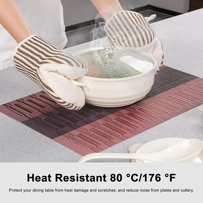 - Quality Material: Crafted from 70% PVC and 30% polyester, our placemats boast a heavier weight than other placemats on the market, combined with precise and dense weaving techniques, making these woven placemats feel thicker and more durable. These vinyl woven place mats are washable, stain-resistant, heat-resistant, non-slip, and long-lasting without fading.