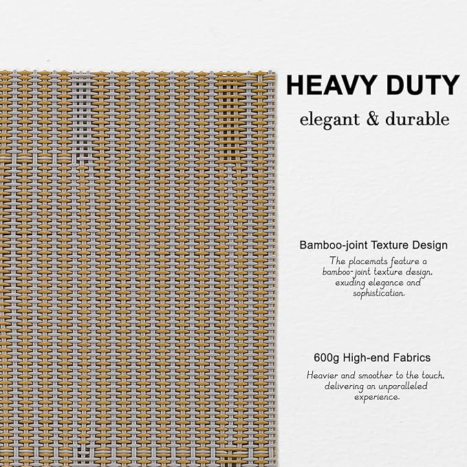 - Quality Material: Crafted from 70% PVC and 30% polyester, our placemats boast a heavier weight than other placemats on the market, combined with precise and dense weaving techniques, making these woven placemats feel thicker and more durable. These vinyl woven place mats are washable, stain-resistant, heat-resistant, non-slip, and long-lasting without fading.
