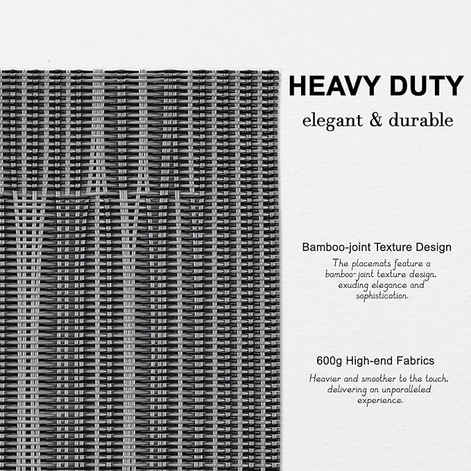 - Quality Material: Crafted from 70% PVC and 30% polyester, our placemats boast a heavier weight than other placemats on the market, combined with precise and dense weaving techniques, making these woven placemats feel thicker and more durable. These vinyl woven place mats are washable, stain-resistant, heat-resistant, non-slip, and long-lasting without fading.