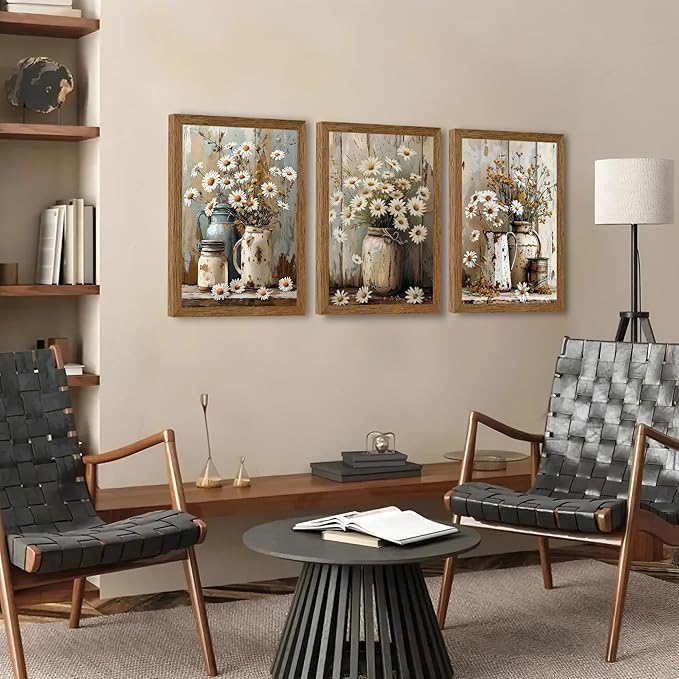 - Vintage Floral Wall Decor : This set of three posters features beautiful rustic flower arrangements. Delicate white daisies and wildflowers are artistically arranged in vintage-style mason jars and jugs, set against a backdrop of weathered wooden planks for an authentic farmhouse aesthetic