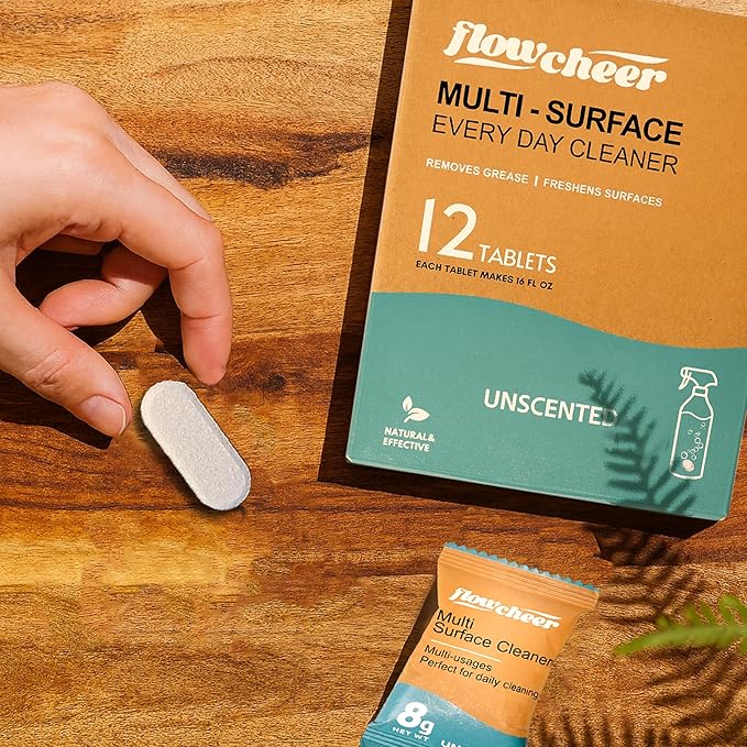 - FREE & CLEAR MULTI-SURFACE CLEANER REFILL: Flowcheer Free & Clear All purpose concentrated cleaner tablets are fragrance-free, dye-free, and gentle on sensitive skin. Simply dissolve one tablet in a reusable 16 fl oz spray bottle filled with water for a powerful, streak-free clean on multiple surfaces throughout your home.