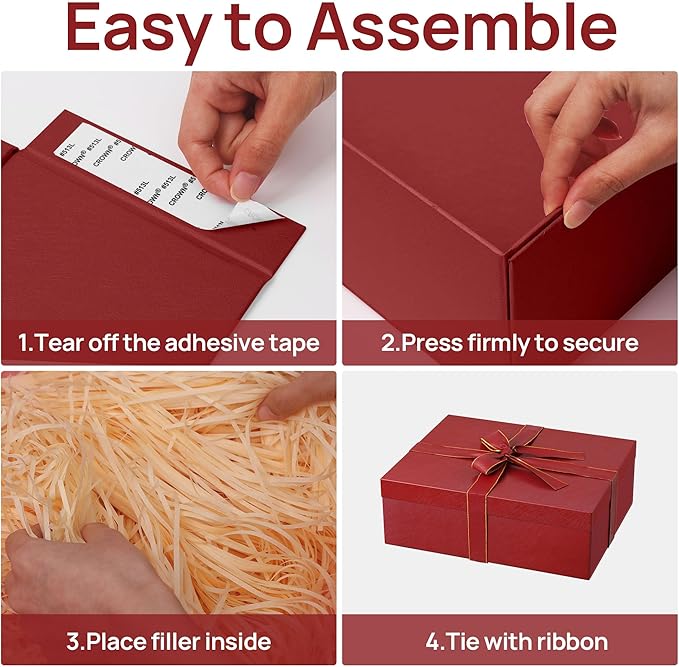 - Easy to Assemble: Before assemble, please check our instruction steps. Just peel off the white tapes at the four corners, open the sides of the large gift box, and press them together for 15s to secure. The gift box will then be firm and ready to use.