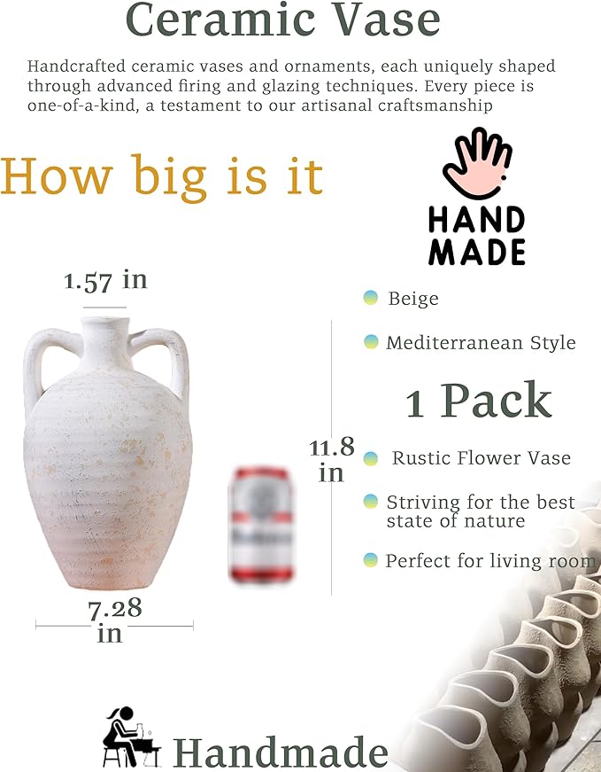 - Mediterranean rustic double handle design:Measuring 7.3" W x 11.8" H with a 9.5" base, this ceramic vase features a rounded silhouette with twin handles, beige speckles, and a distressed antique white finish for a timeless farmhouse aesthetic.