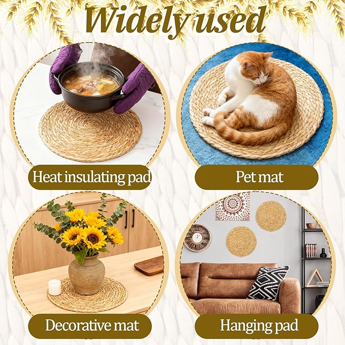 - Elegant Rustic Design: Rustic placemat set can be used not only for tableware but also for pots and pans in the kitchen. These round placemats are suitable for coffee tables, side tables, desks, and more, ideal choice for bedroom, living room, kitchen, dining table, and Christmas decor. To complement your home's rustic, vintage, or boho-inspired interior design, hang these handwoven jute placemats on the walls.