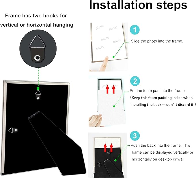 - Versatile Display Options: Designed for flexibility, this 8x10 photo frame can be easily positioned both horizontally and vertically and is perfectly suited for placement on a tabletop, desk, or shelf, or for hanging on the wall.