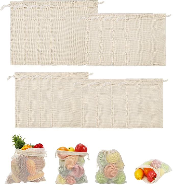 16 Pack Reusable Produce Bags, Mesh Vegetable Grocery Bag Washable, 100% Cotton Drawstring Net Storage Bags for Refrigerator, Shopping, Veggies and Fruits, Beach, Transporting, Durable, (4XL,4L,4M,4S)