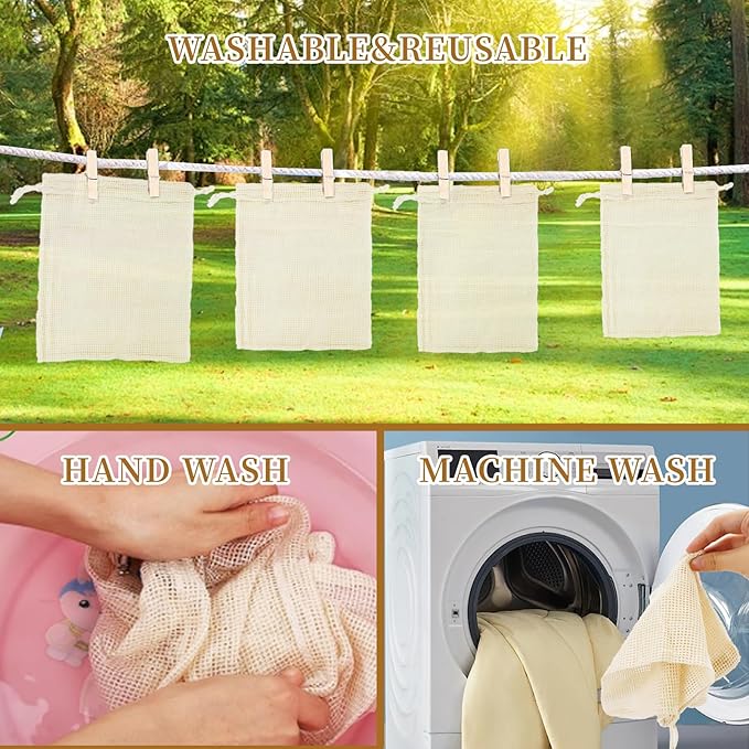 - 【Lightweight and Breathable】The organic bags features a breathable mesh design, which effectively preserves the freshness of produce and extends its shelf life compared to plastic and non-breathable bags. The lightweight material makes travel and shopping easier, and the produce storage is reusable after washing. Machine washable (gentle and low temperature), but hand washing in cold water is recommended
