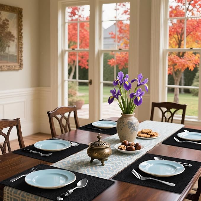 - √ MATERIALS: Our placemats are made of linen and cotton, durability and washable, liquid can go through placemats, anti-heat and anti-stain, protecting your table from all kinds of debris and stains