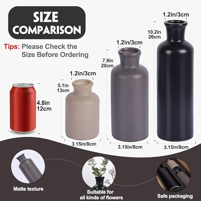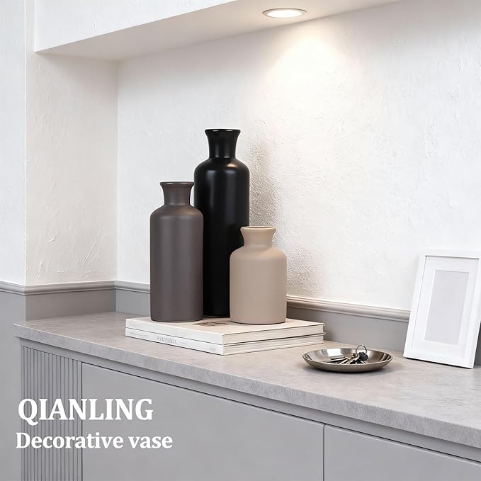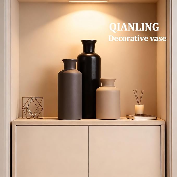 - 【Modern Neutral Matte Ceramic Vase Set】: This decorative vase trio features three complementary designs in black, charcoal gray, and warm beige—crafted in soft neutral color tones with a refined matte texture. Their minimalist silhouettes and muted finishes blend effortlessly with farmhouse, Japandi, boho, or modern interiors, making them a timeless accent for any home style