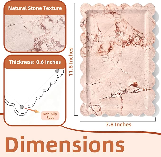 - 【IDEAL SIZE】- 11.8” x 7.8” x 0.6". With scalloped edges like petals. The whole piece of stone is carved into one piece. The bottom of the marble tray is equipped with non-slip rubber feet pad to prevent the serving tray from sliding around.