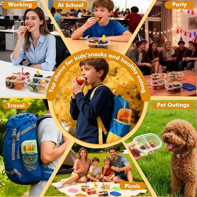 - 【MULTI-USE FOR ANY OCCASION】Designed for versatility, these containers are suitable for meal prepping, school lunches, office snacks, picnics, camping, and travel. They efficiently store nuts, crackers, and other portable snacks, promoting portion control and helping to reduce single-use packaging waste.