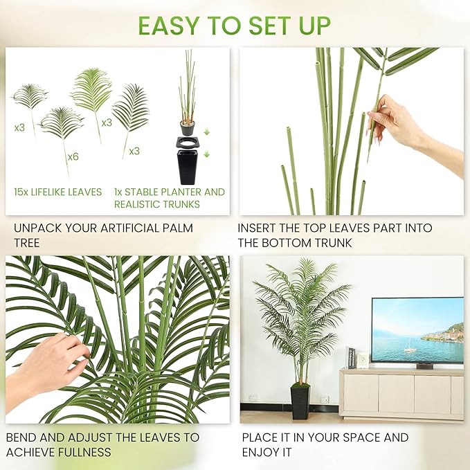 - Artificial Moss & Modern Planter Included: This faux palm tree comes pre-potted in a durable 15.7-inch square planter, topped with realistic artificial moss for a clean, natural finish. Choose between a black or white planter to match your interior — whether modern, minimalist, or boho — and instantly elevate your living room, office, or entryway decor.