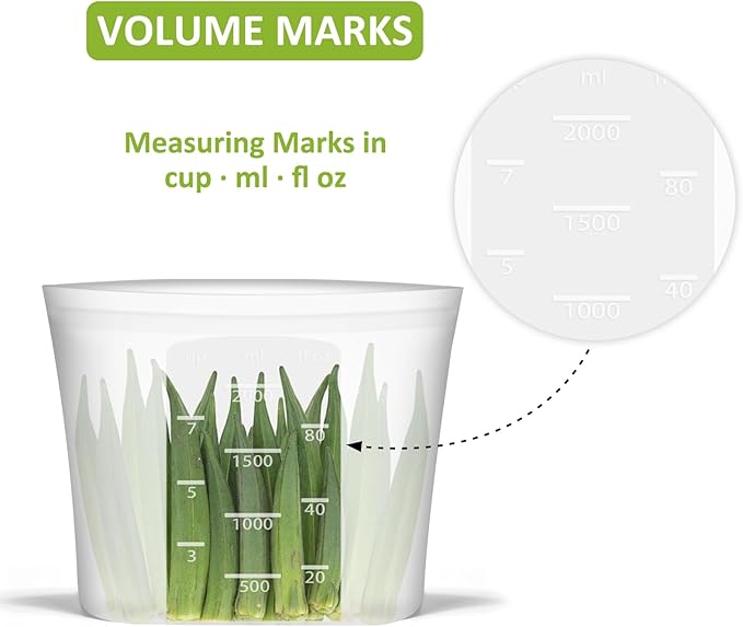 - 【EXTRA LARGE & ECONOMICAL】Capacity of each: 1/2 gallon/67 fl.oz/2000 ml, 4 Pack in total. The new large size perfect for storing meats, large fruits, or bulk meals. These reusabe storage silicone bags come with clearly volume marks in cups, milliliters and fluid ounces for easy use. The translucent body helps to get a glimpse of what's inside, though not in crystal clear detail. Plus, Each bag can replace 300+ single-use plastic bags a year, promoting a waste-free world