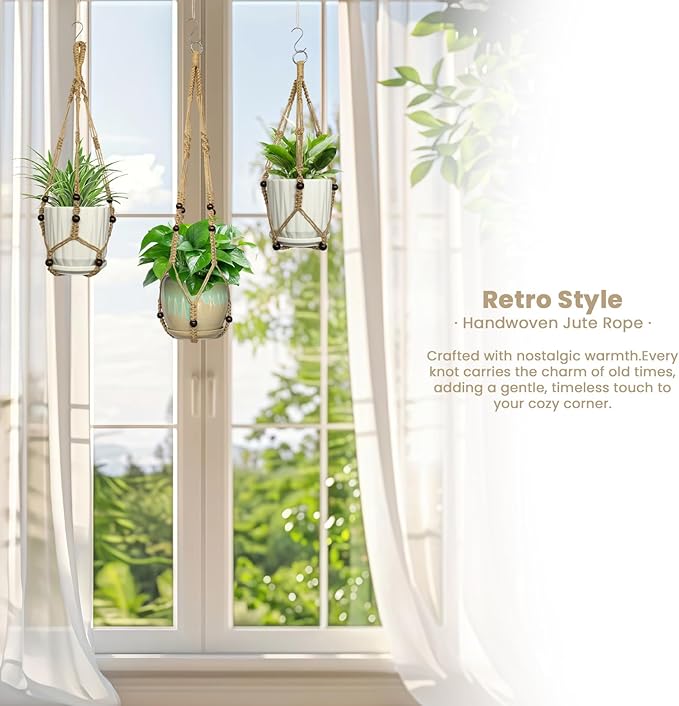 - 【Natural Jute & Boho Chic Style】Crafted from natural jute, these plant hangers bring an organic, bohemian touch to any room. The sturdy and flexible woven design is not only durable but also adds a warm, textural element to your living room, patio, or porch, perfectly complementing boho and farmhouse decor styles.
