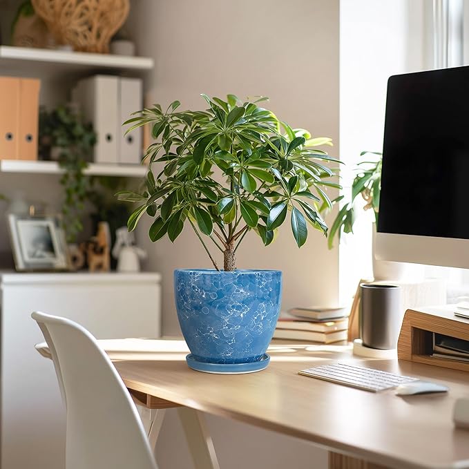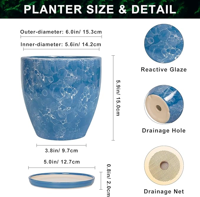- Ceramic Plant Pot with Drainage Hole and Saucer: This blue planter measures 6.0" D x 6.2" H, the drainage holes can effectively remove excess water from the 6 inch plant pot to prevent root rot, while the saucer can catch excess water seeping out from the bottom of the ceramic flower pots for indoor plants